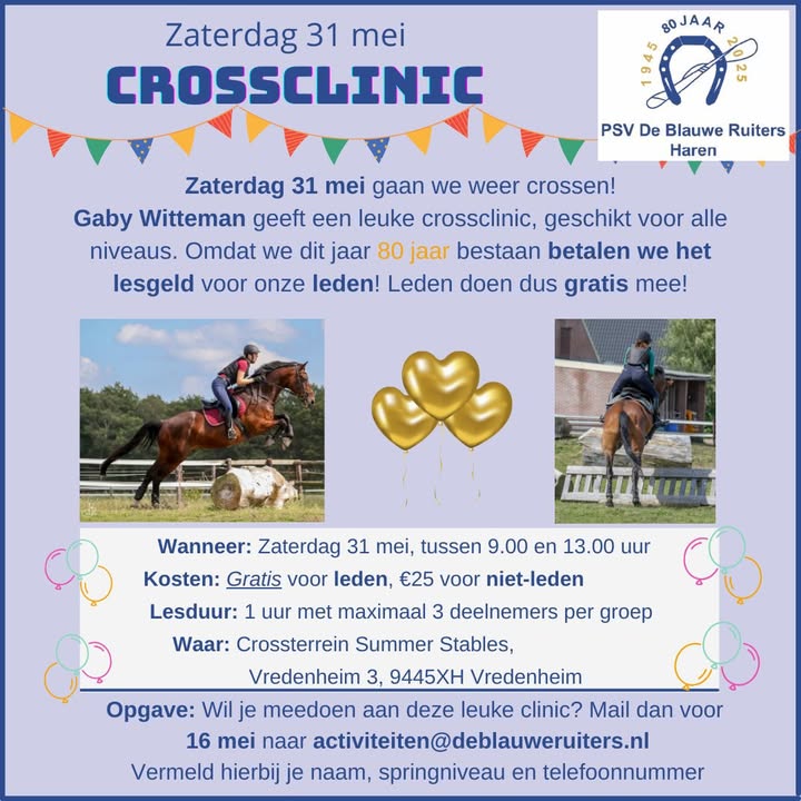 Zaterdag 31 mei organiseren we tussen 9.00 uur en 13.00 uur een crossclinic bij de Summer Stables in Vredenheim! Gaby Witteman @eventingforall geeft een hele leuke clinic voor alle niveaus!